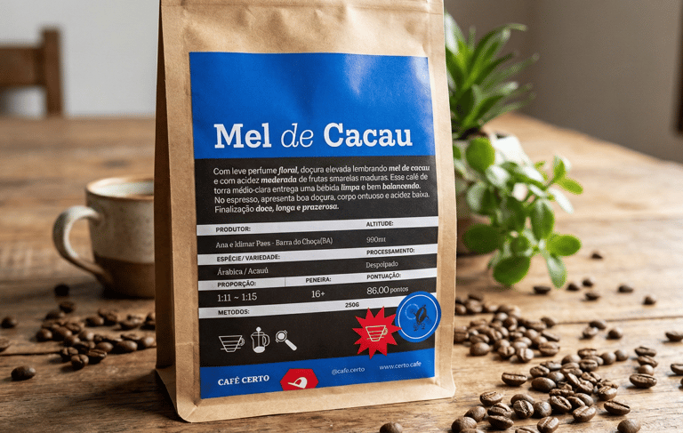 Com leve perfume floral, doçura elevada lembrando mel de cacau e com acidez moderada de frutas amarelas maduras. Esse café de torra média-clara entrega uma bebida limpa e bem balanceada. No espresso, apresenta boa doçura, corpo ontuoso e acidez baixa. Finalização doce, longa e prazerosa.